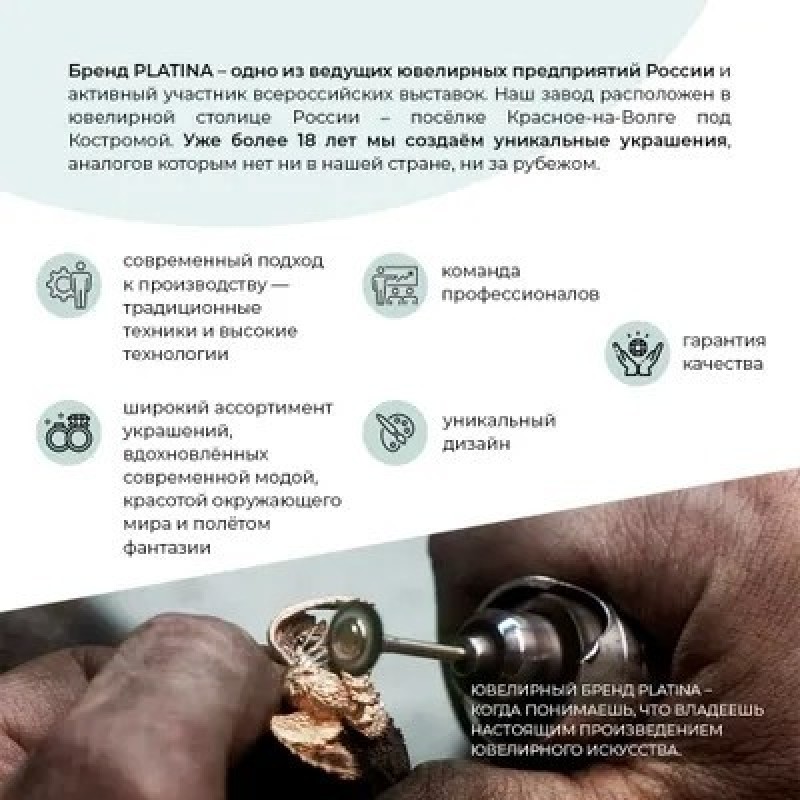 ОписаниеИзделие выполнено из белого золота; Вставка: Бриллиант; Арт. 01-5166-00-101-1120-30.Гарантия 6 месяцев.Гарантия подлинностиК каждому нашему украшению есть бирка-паспорт изделия с уникальным идентификационным номеромРекомендацииЧтобы украшение долго радовало вас своей красотой, просто соблюдайте эти рекомендацииО насБренд PLATINA - одно из ведущих ювелирных предприятий России и активный участник всероссийских выставокПоделитесь мнениемРаботать для вас - это большая ответственность и большое счастье для нас!